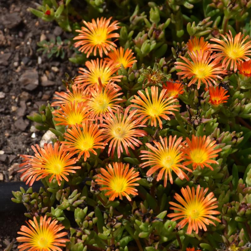 A low growing succulent, native to South Africa but amazingly hardy in North America; dazzling orange daisy-like flowers with yellow centers; green foliage has burgundy overtones in fall; perfect for xeriscapes, rock gardens, screes and sandy soils.