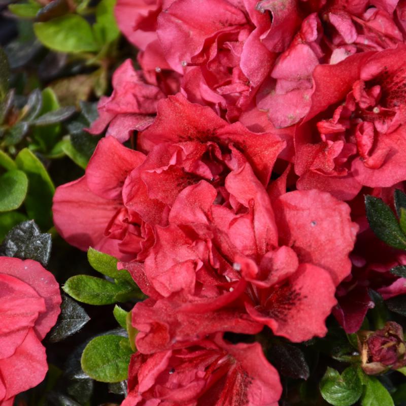 Clusters of true red semi-double blooms cover this azalea in mid-spring, with additional flushes in summer and fall; very heat tolerant; great massed or as an accent plant; needs highly acidic and organic soil that is well drained.
