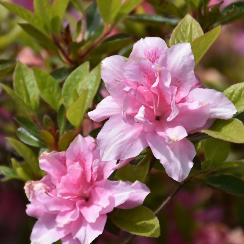 Clusters of semi-double blooms that are a delicate pink cover this azalea in mid-spring and again for a lighter encore in fall; an upright shrub that is great for planting in groups; needs highly acidic and organic soil that is well drained.
