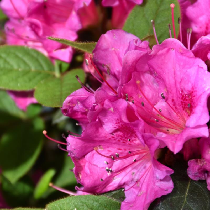Clusters of blooms that are hot pink with lavender highlights cover this azalea in mid-spring and again for a lighter encore in fall; deep green glossy foliage turns dark purple in winter; needs highly acidic and organic soil that is well drained.
