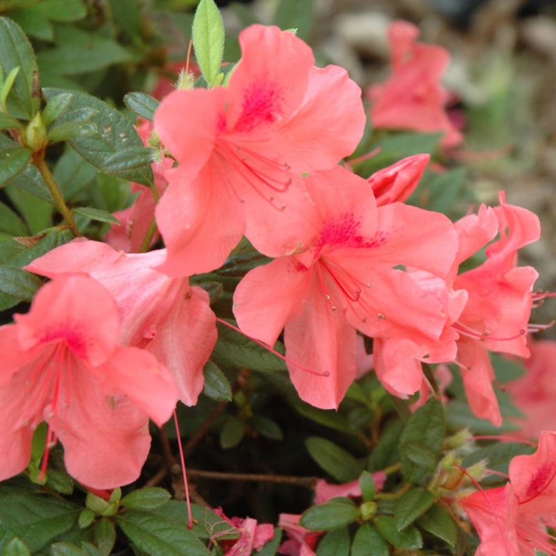 Clustered blooms that are deep coral, with hot pink flecks, cover this azalea in mid-spring with additional, lighter flushes in summer and fall; deep green glossy foliage emerges light green; needs highly acidic and organic soil that is well drained.
