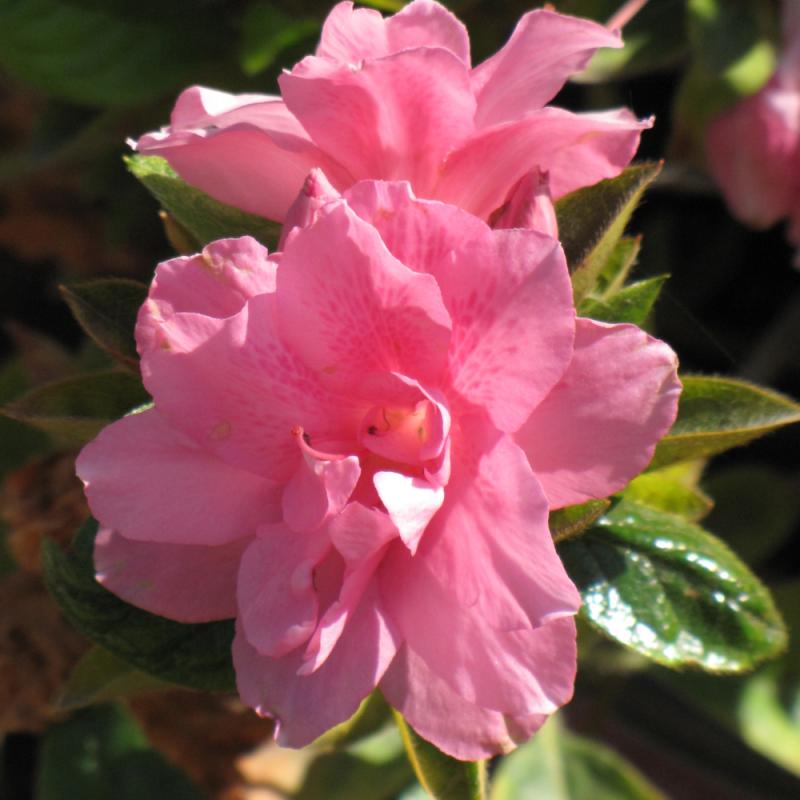 Clusters of semi-double blooms that are a medium pink cover this azalea in mid-spring and again for a lighter encore in fall; an upright shrub that is great for planting in groups; needs highly acidic and organic soil that is well drained.