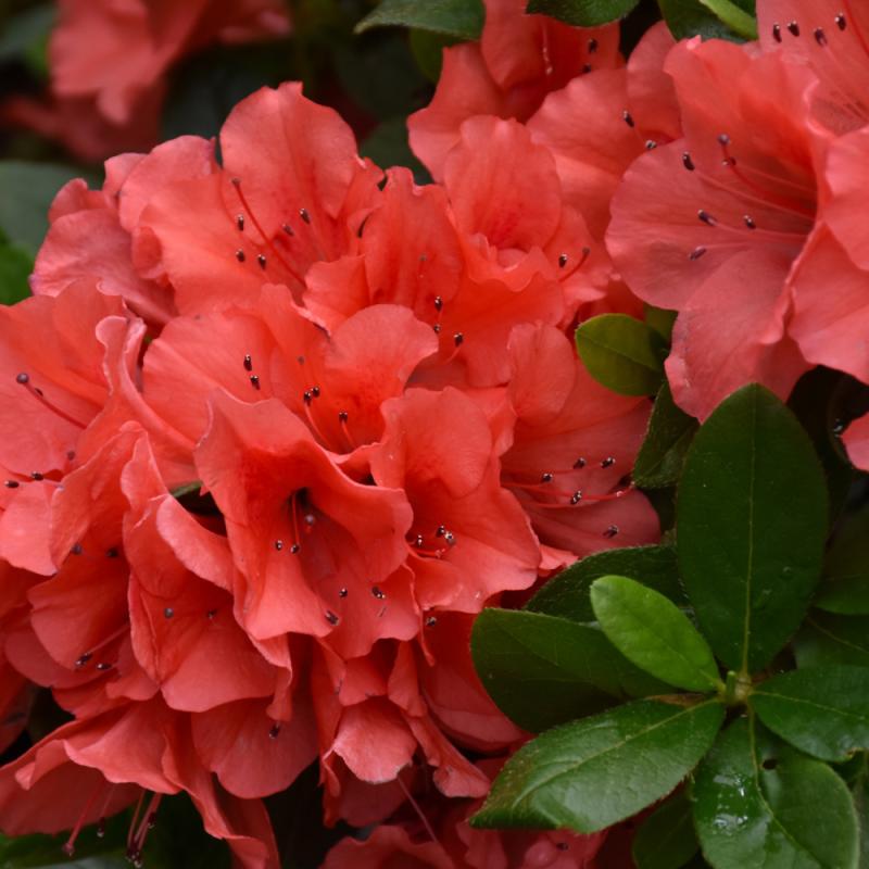 Clusters of blooms that are cherry red with orange highlights cover this azalea in mid-spring and again for a lighter encore in fall; an upright shrub that is great for planting in groups; needs highly acidic and organic soil that is well drained.