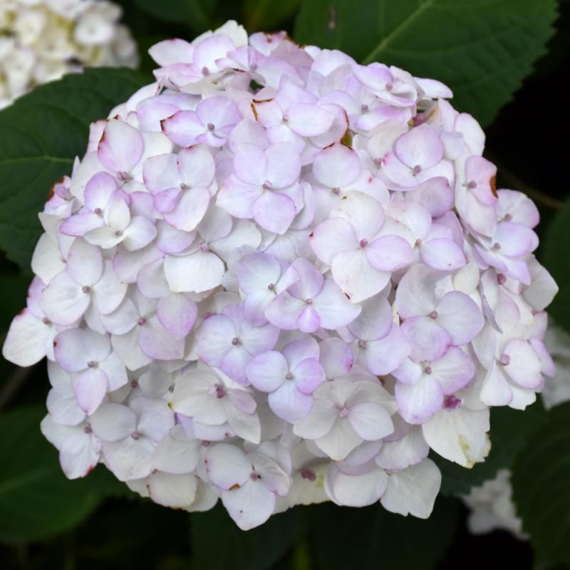 This exciting new shrub is the second in Bailey's Endless Summer series, offering large snow-white ball-shaped flowers with semi-double florets which fade to soft pink; blooms over an extended season on both old and new wood extending its hardiness range.