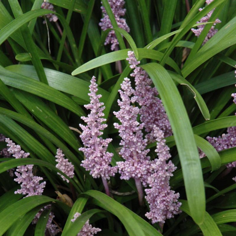 A tufted grass like perennial that features a clump of arching, glossy, dark green leaves; features a beautiful display of lovely powerdery blue flower spikes; best used as an edging plant or massed as a groundcover.
