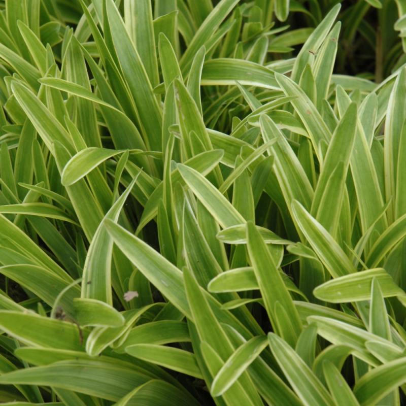 A tufted grass like perennial that features a clump of arching, glossy, green and white varigated leaves; a beautiful display of lovely purple-lavender atop showy flower spikes; it is best as an edging plant or massed as a groundcover.