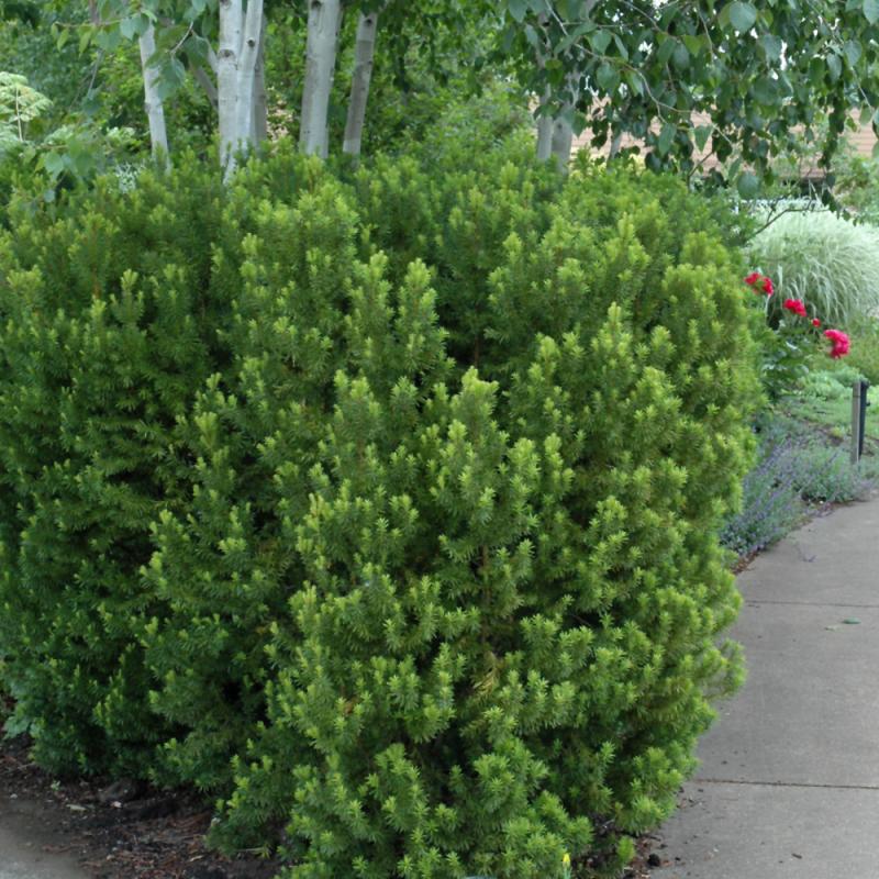 A top notch landscape shrub featuring a dense, upright habit and bright green emerging foliage held over dark evergreen needles in spring; becomes quite large, makes a great hedge, takes pruning very well; one of the few evergreens that loves shade.