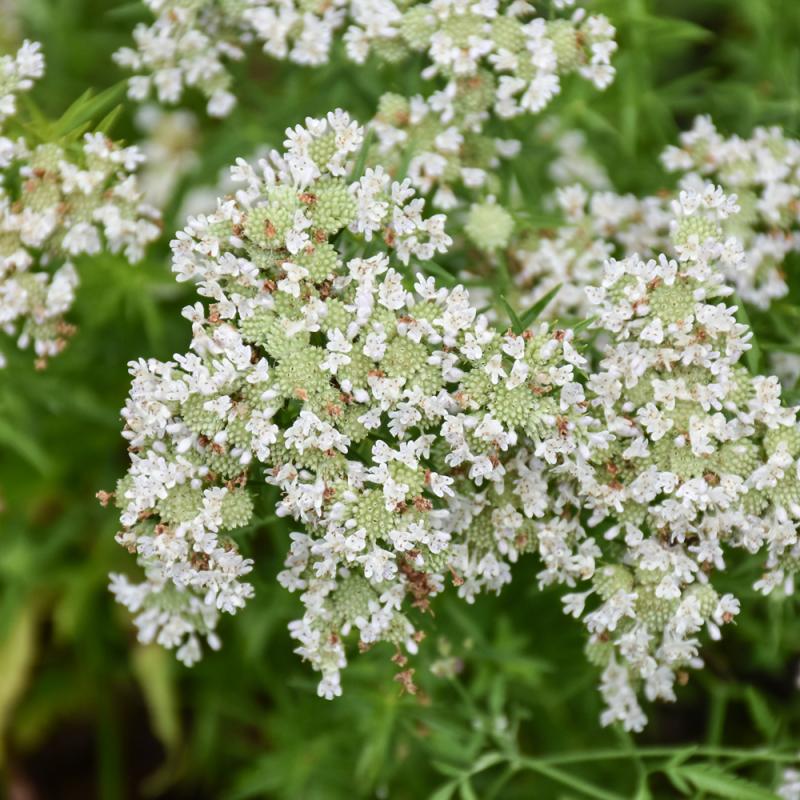 Narrow Leaf Mountain Mint has masses of beautiful clusters of white flowers with lavender overtones and purple spots held atop the stems from early summer to early fall, which are most effective when planted in groupings. The flowers are excellent for cutting. Its attractive fragrant narrow leaves remain grayish green in color with hints of silver throughout the season.